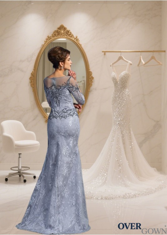 Lace Beaded Trumpet Mermaid Mother of the Bride Dress with Bateau Neck and 3/4 Sleeves