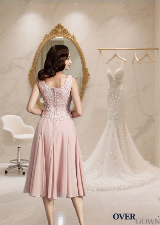 Tea-Length A-Line Chiffon Mother of the Bride Dress — Scoop Neck Sleeveless Gown