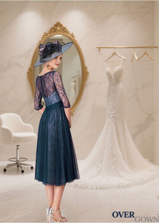 Tea-Length Tulle Lace V-Neck Illusion Sleeve Mother of the Bride Dress - Wedding Guest Gown