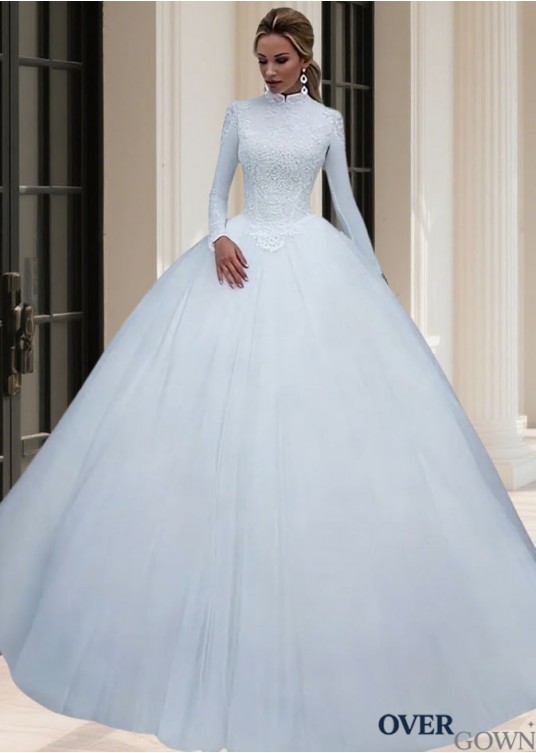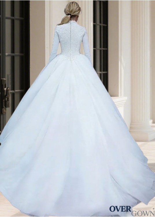 Satin Ball Gown Wedding Dress High Neck Long Sleeves Chapel Train